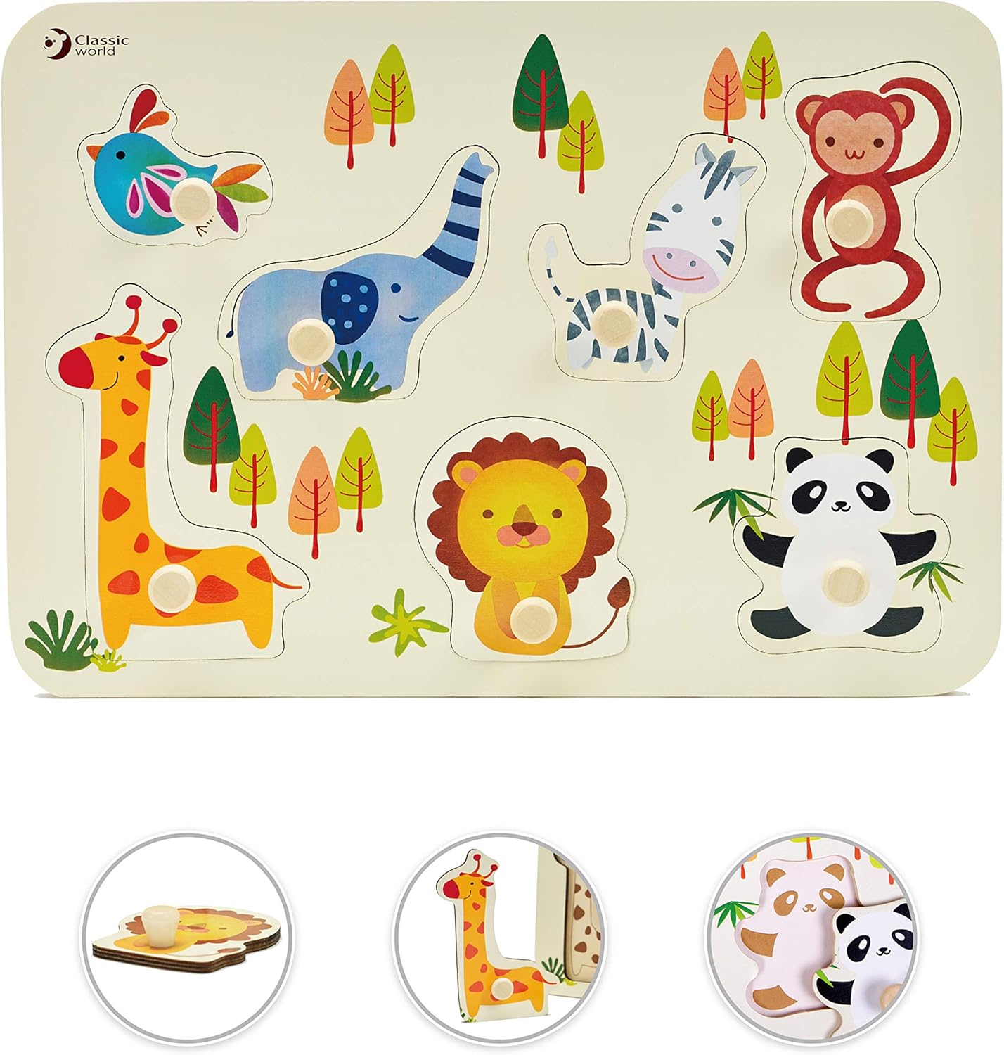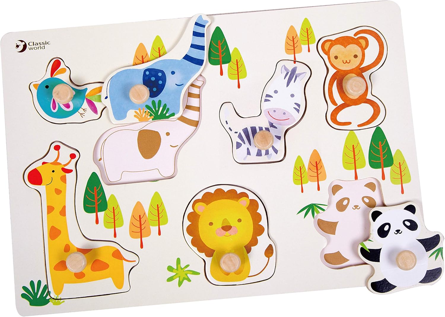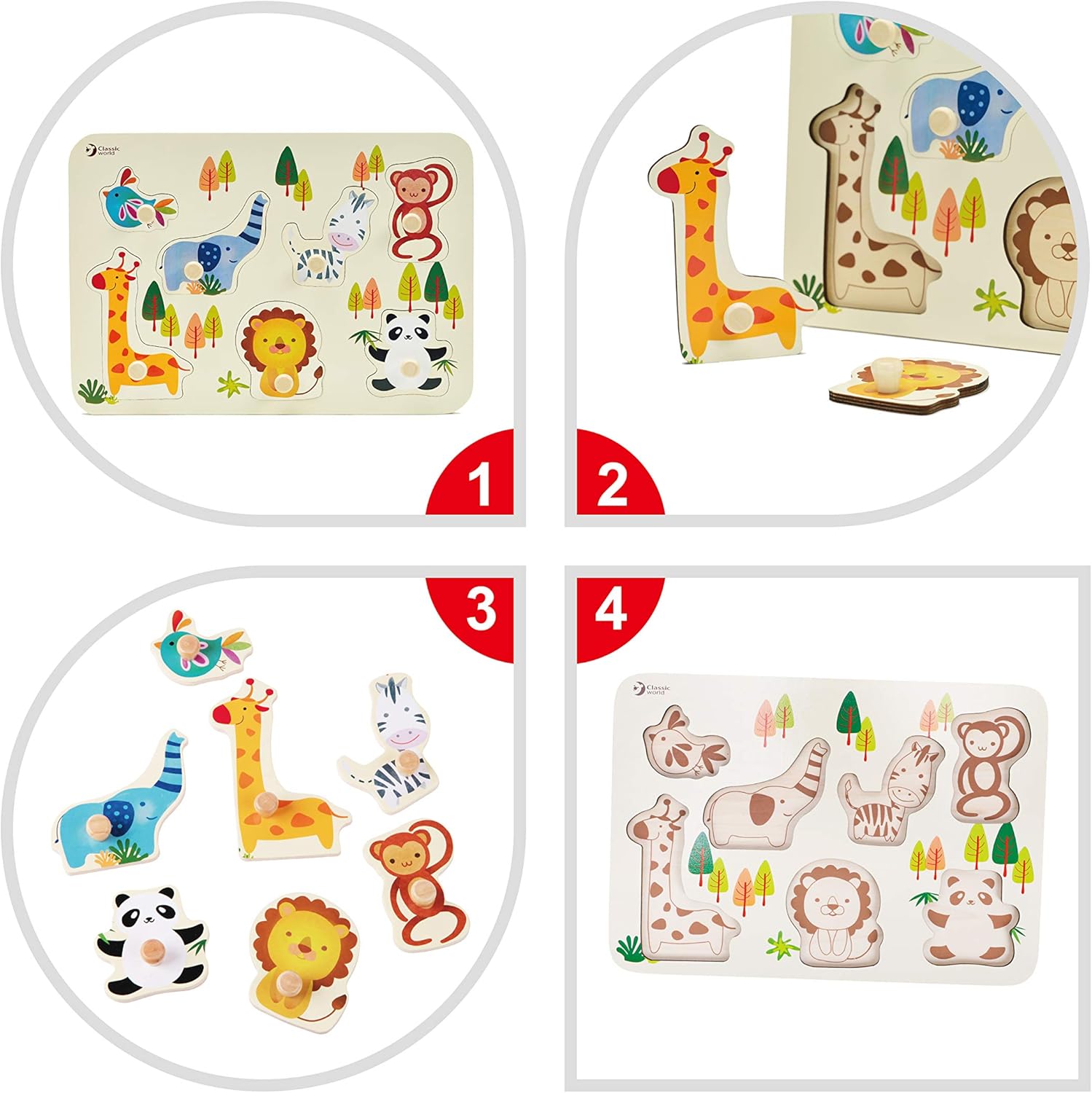 A gyerekek kihúzzák és visszaillesztik az állatfigurákat a megfelelő helyükre az alaplapon, miközben megtanulják az állatok neveit és felismerésüket.