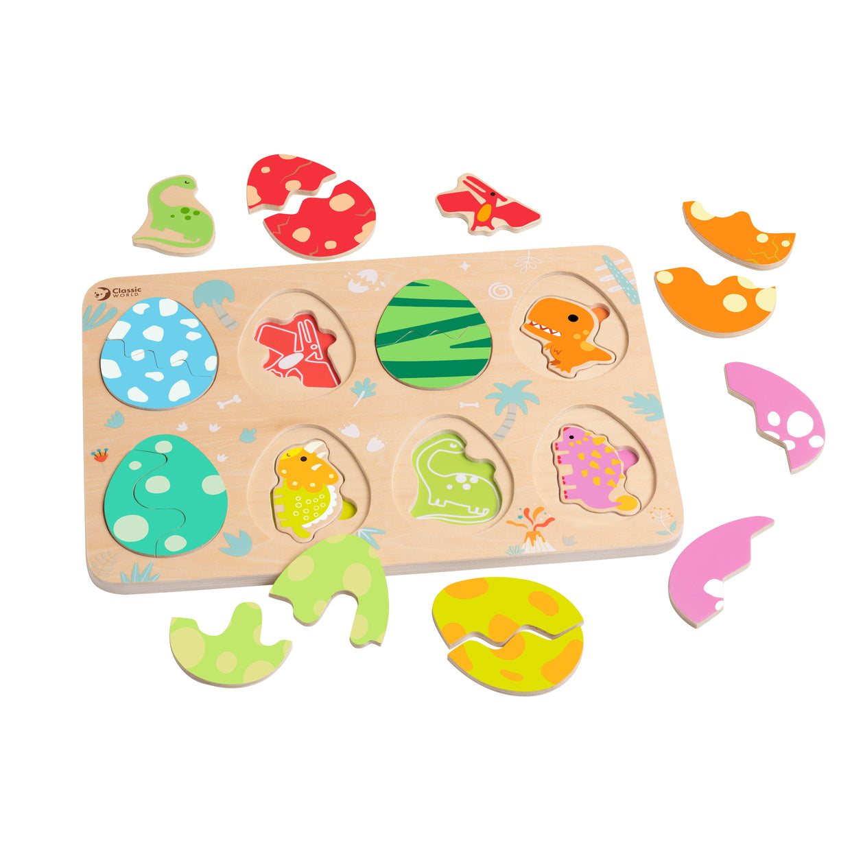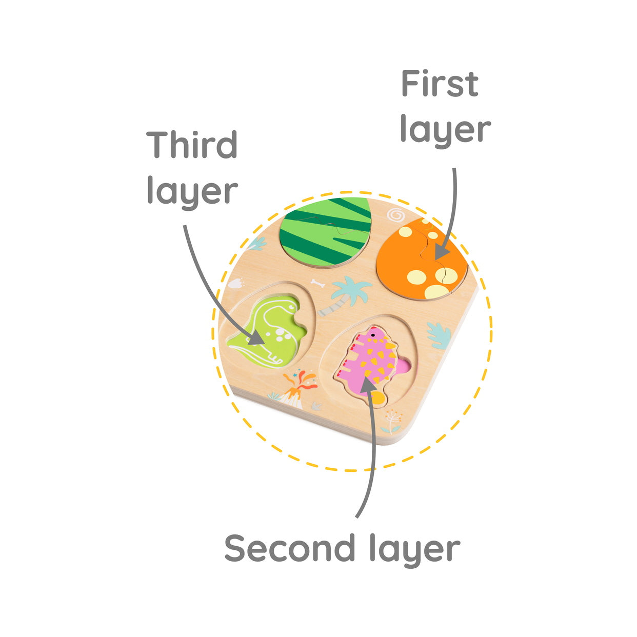 Ez a háromrétegű dínós kirakó izgalmas felfedezést kínál a gyerekeknek. A felső réteg színes dínótojásokat mutat, amelyek eltávolításával előtűnnek a hozzájuk illő dinoszauruszok.