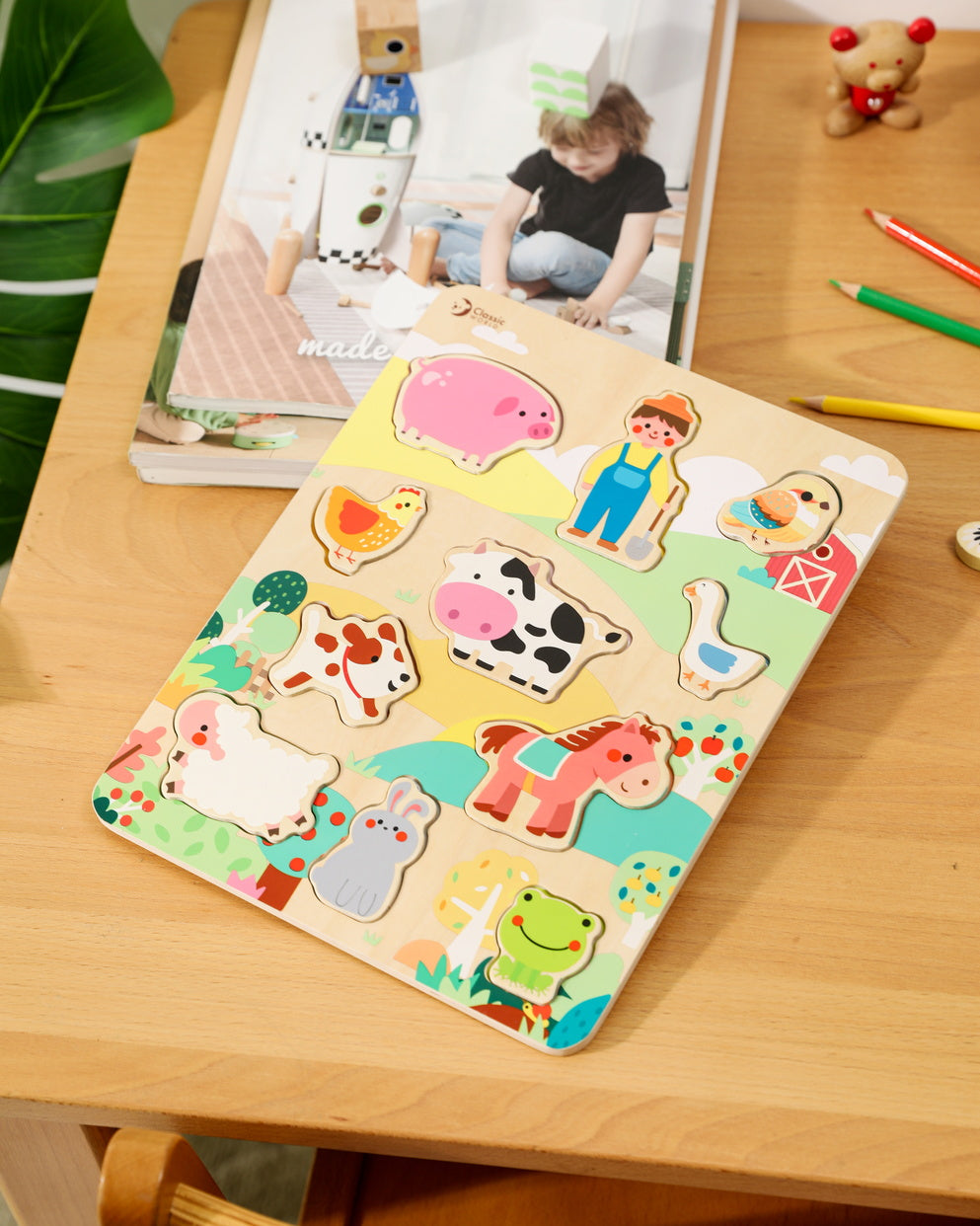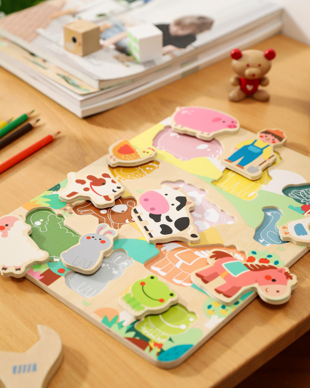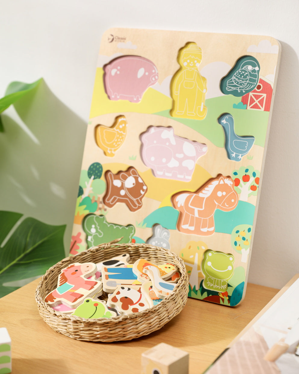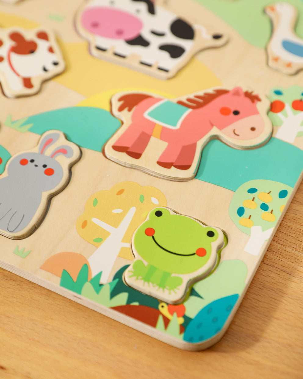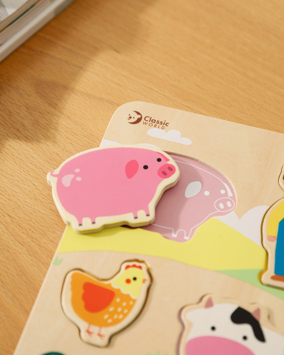 A gyerekek beillesztik a formákat a megfelelő helyre, miközben felfedezik a farm részleteit és az állatokat.