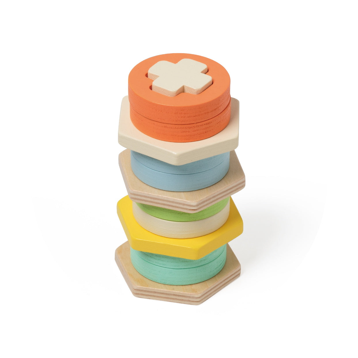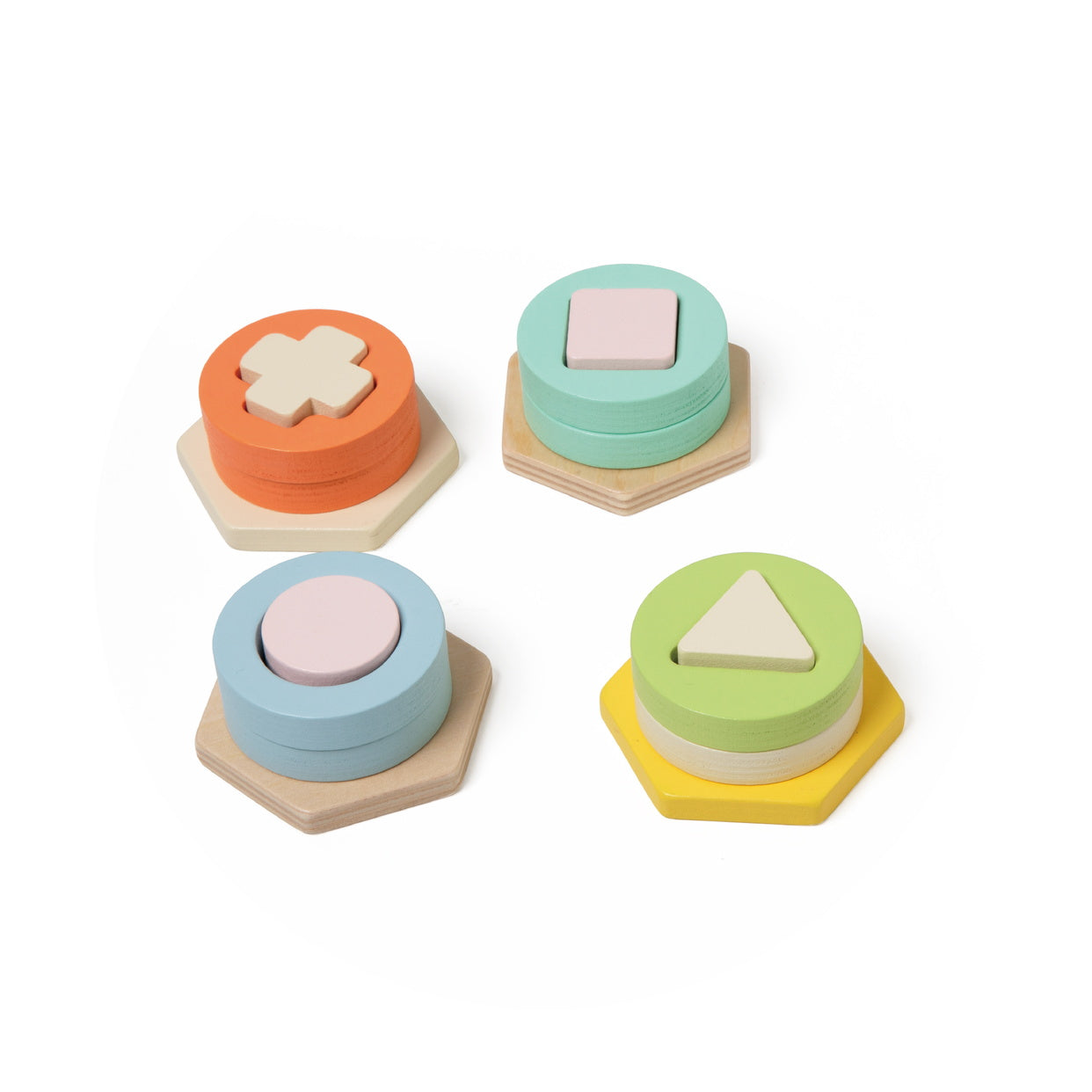 Ez a készségfejlesztő formaberakó játék négy különböző színű és alakú oszlopot, valamint nyolc egyedi formájú elemet tartalmaz. A gyerekeknek meg kell találniuk, melyik forma melyik oszlophoz illik, miközben felfedezik a színek és formák világát.