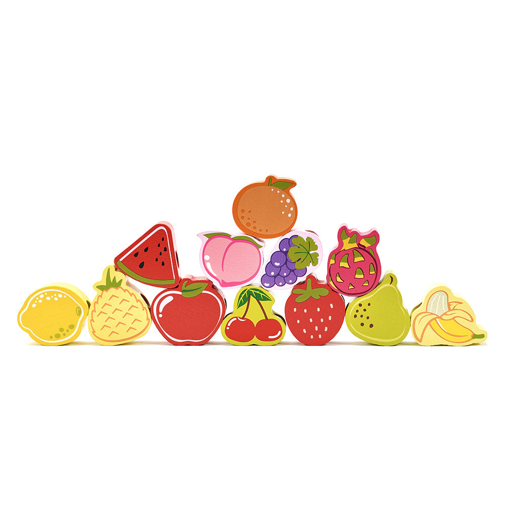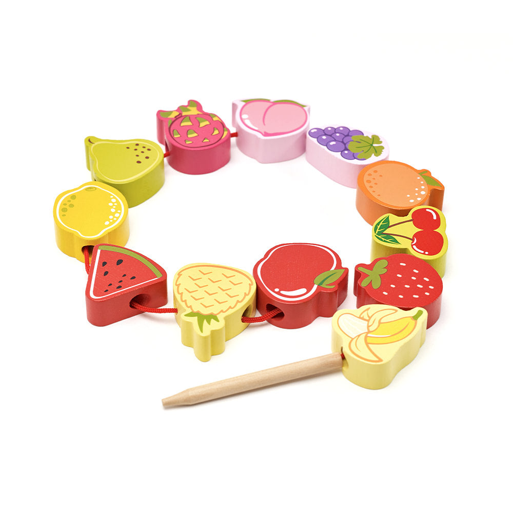 A fűzhető készlet 12 színes gyümölcsöt tartalmaz.