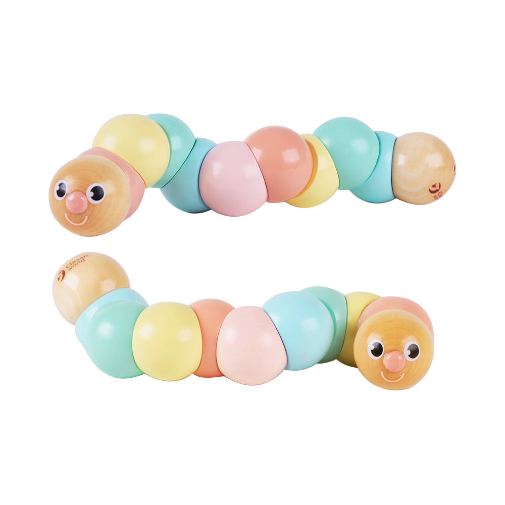Ez a bájos kukac éppen megfelelő méretű a kisgyermekek kezéhez, így könnyen megfogható. Tartós teakfából készült, vízbázisú festéssel, és belső rugalmas szalagja lehetővé teszi a könnyű hajlítást és csavarodást.
