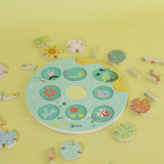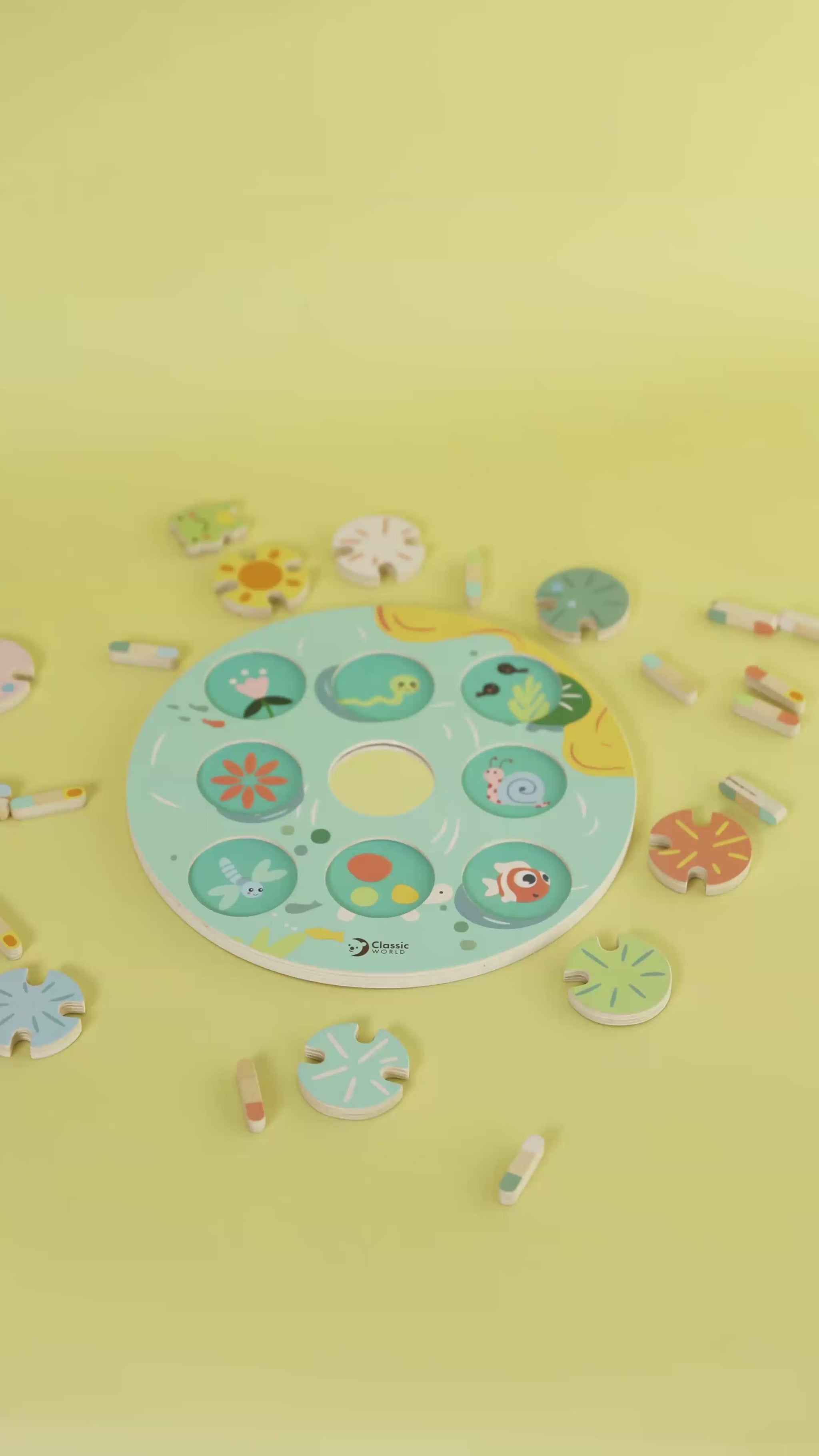 Ez a színes, lótuszlevelek és tavacskák témájára épülő játék segít a gyerekeknek a formák és színek felismerésében. A játékhoz tartozó fa lótuszlevelekre rögzíthető pálcikákkal a béka szabadon ugrálhat egyik levélről a másikra.