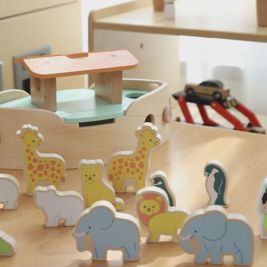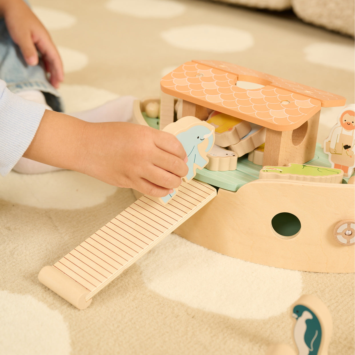 Ezzel a gondosan megmunkált fa játékkészlettel a gyerekek építhetik és játékosan élhetik át Noé bárkájának kalandját.