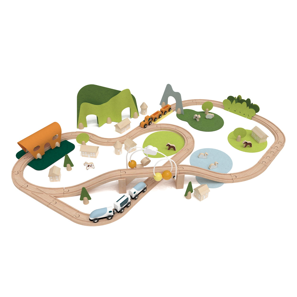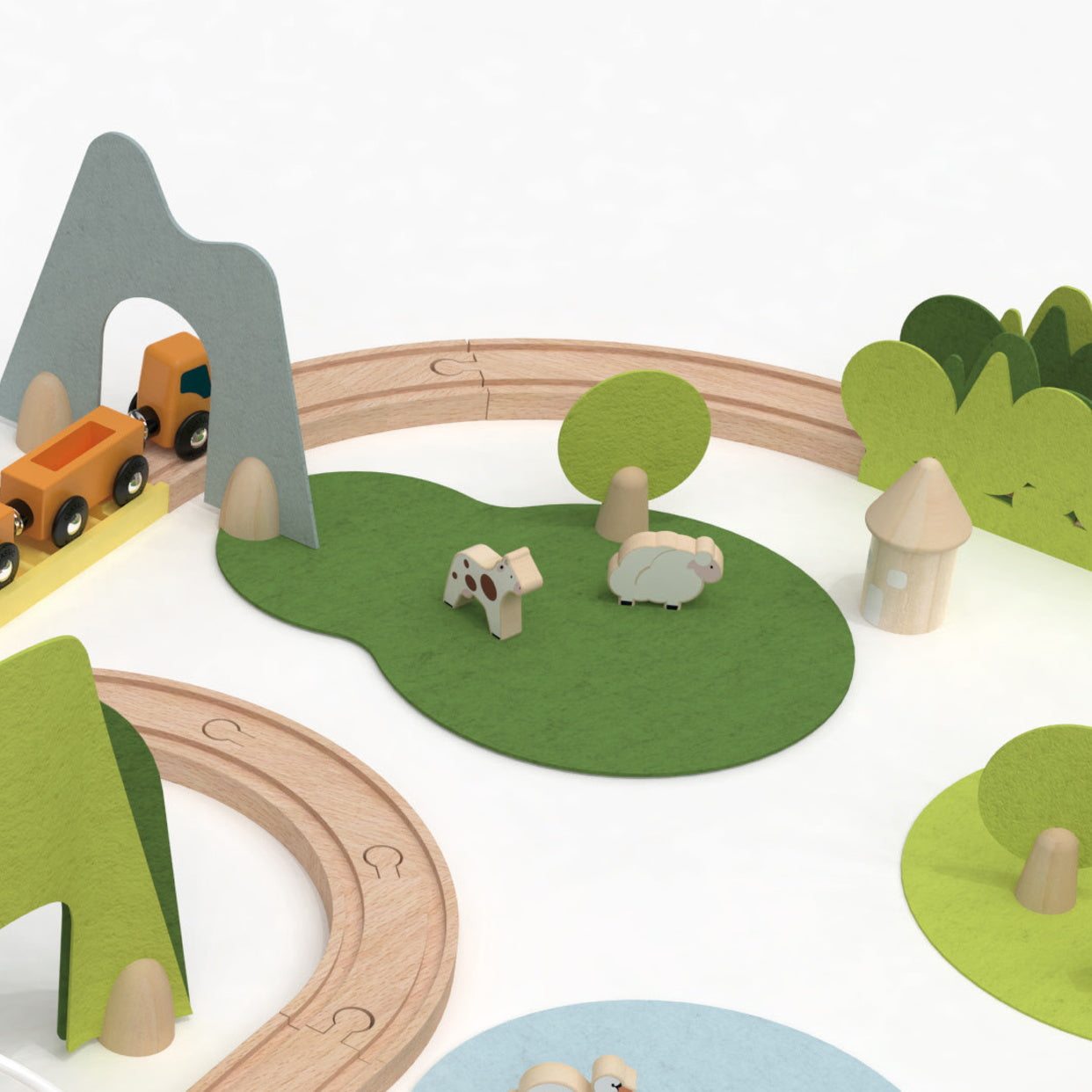 Áthalad xilofon hídon, rezgő pályán, viadukton márványos csúszdával, és eljut a vasútállomásra. Egy másik vonat tartja a farmállatokat a mezőkön és tavakon át. A fa építőelemekből házikók is készíthetők, amelyek a pálya köré rendezhetők, így a játék mindig új történeteket kínál.