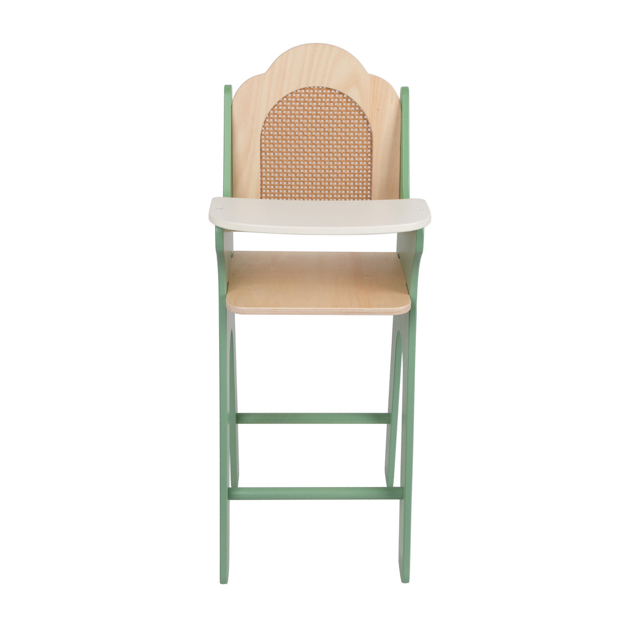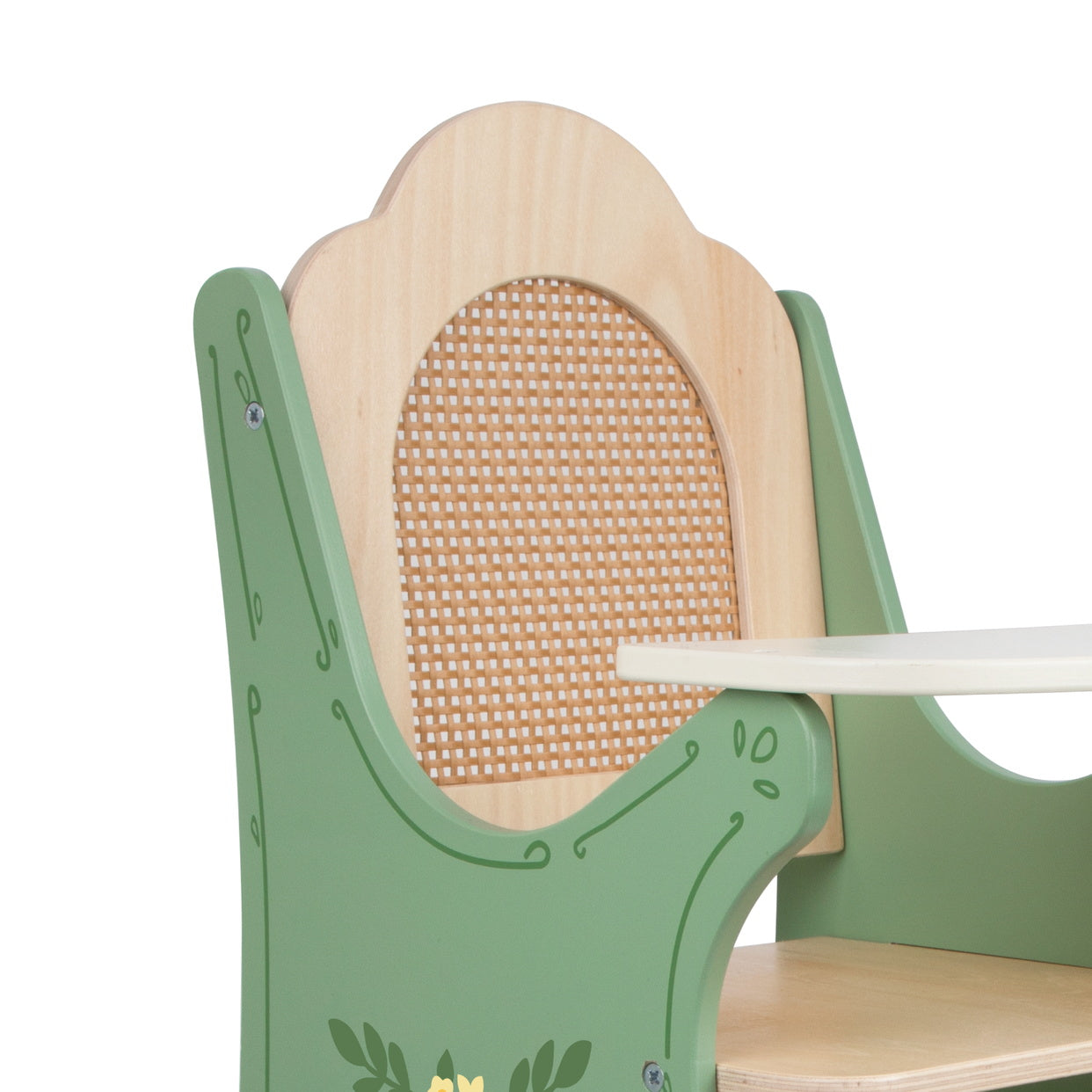 Ez a zöld színű etetőszék kedves virágmintákkal és rattan fonással a háttámlán klasszikus retro hangulatot áraszt.