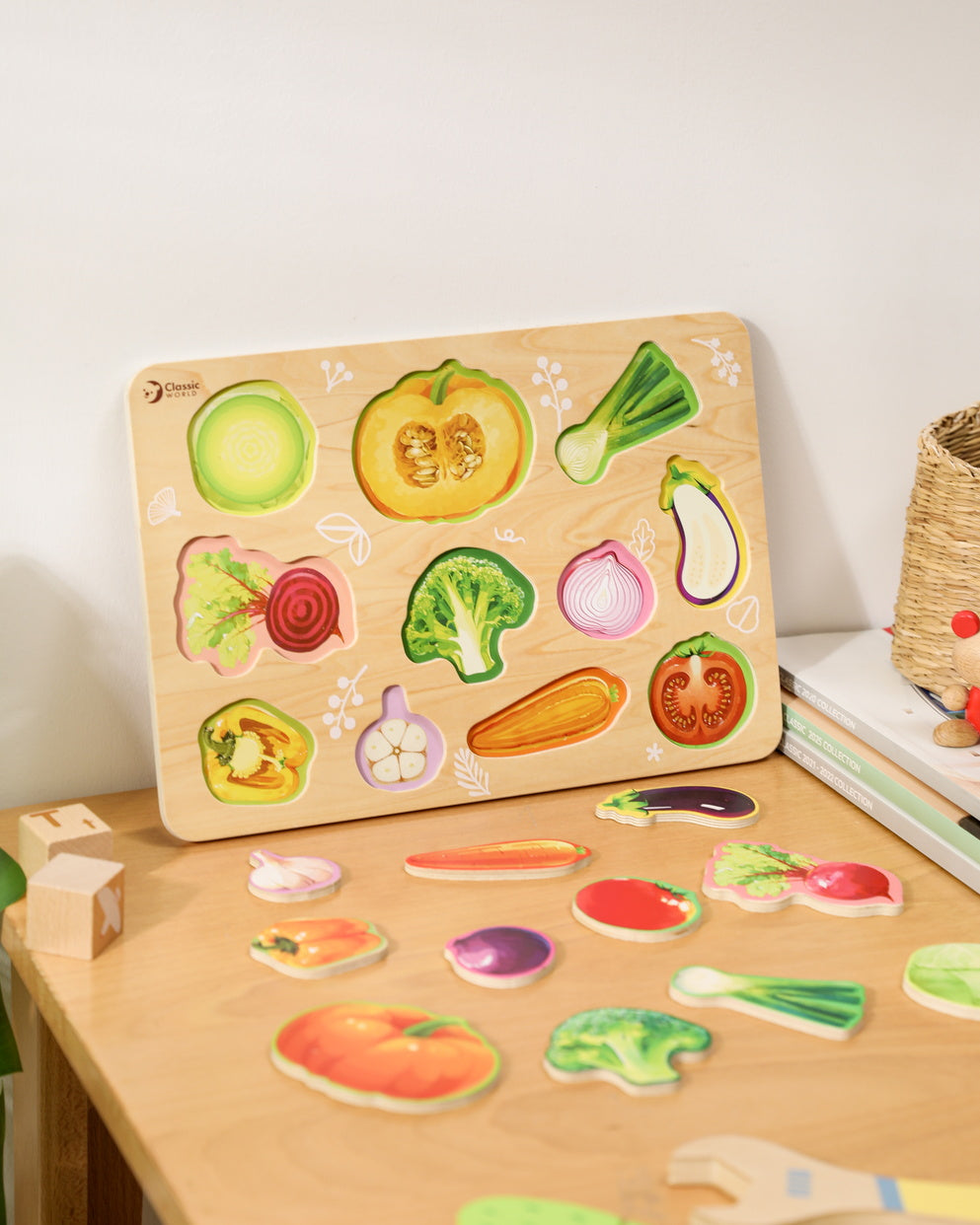 A gyerekek beillesztik a formákat a megfelelő helyükre, miközben felfedezik a zöldségeket és játszanak velük.
